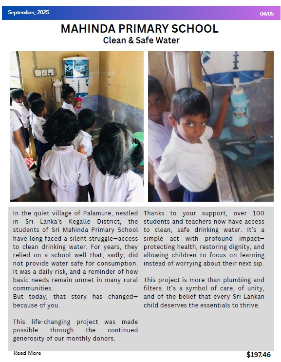 And in Palamure, Kegalle, over 100 students at Sri Mahinda Primary School now have access to clean, safe drinking water through a newly installed filter system, protecting their health and dignity.