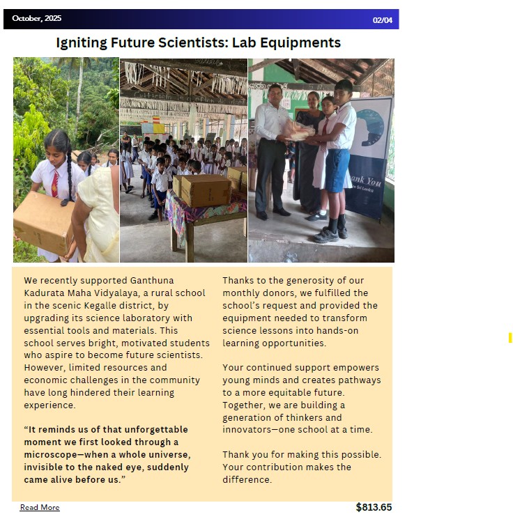 1. In the scenic hills of Kegalle, students at Ganthuna Kadurata Maha Vidyalaya stepped into a brighter future. Their old science lab—once quiet and under-equipped—now holds new microscopes, tools, and materials that bring lessons to life.