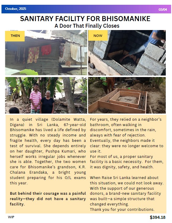 2. Meanwhile, in Dolamite Watta, Digana, a grandmother named Bhisomanike lived every day with a fear most of us will never know. With no sanitary facility, she and her family walked to a neighbor’s bathroom—rain or shine, day or night—often facing discomfort and rejection.