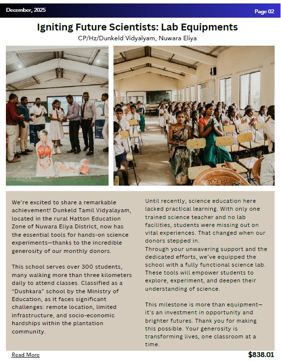 A fully equipped science lab now empowering 300+ students in Dunkeld Tamil Vidyalayam — giving them practical learning for the first time.