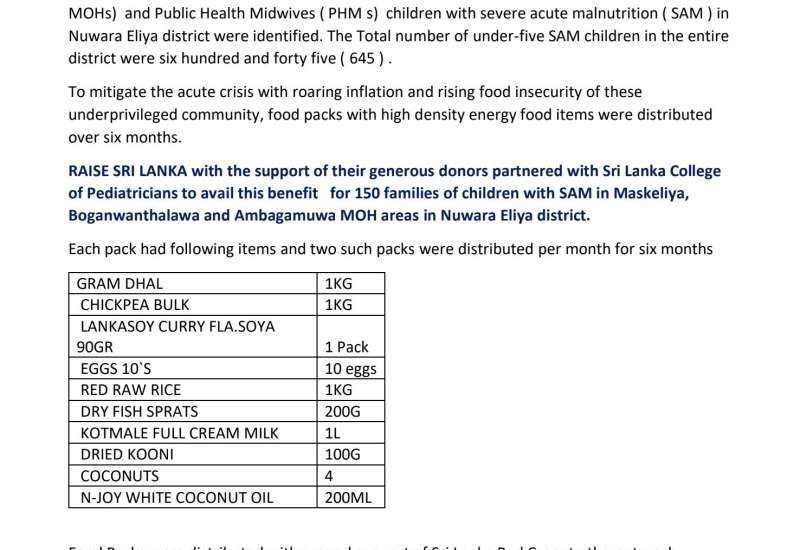 RAISE SRI LANKA with the support of our generous donors partnered with Sri Lanka College of Pediatricians to avail this benefit for 150 families of children with SAM in Maskeliya,