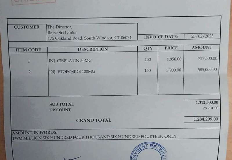 The donation was received by the Director - of Apeksha Cancer Hospital, Dr. Aruna Jayasekara today in the presence of Dr. Harindri Dinushika Pathiraja who has keenly worked with us in the past two weeks in coordinating this effort along with the pharmacist Miss. Sumudu and the supplier Esses Pharma. Attached invoice and appreciation letter from the hospital.